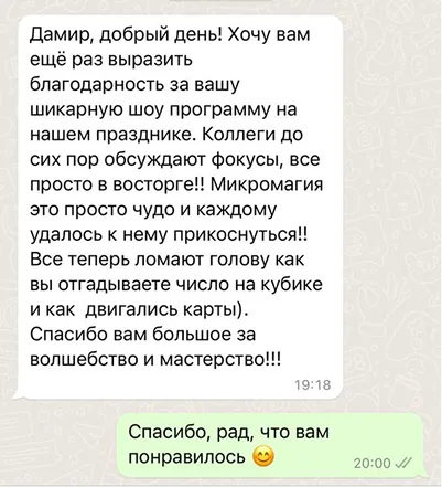 Фокусы на расстоянии вытянутой руки — прямо у вас перед глазами. Каждый гость получает личную порцию магии: вы можете проверить всё, заглянуть под любым углом… и всё равно останетесь без ответа. Максимальное удивление, полный шок и неподдельные эмоции — гарантирую.